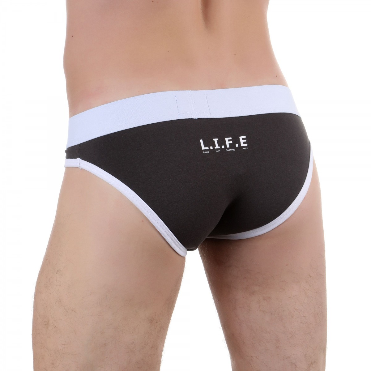 Темно-серые мужские трусы-слипы L.I.F.E. Сзади надпись L.I.F.E. с расшифровкой - Living Isn’t F*cking Easy.