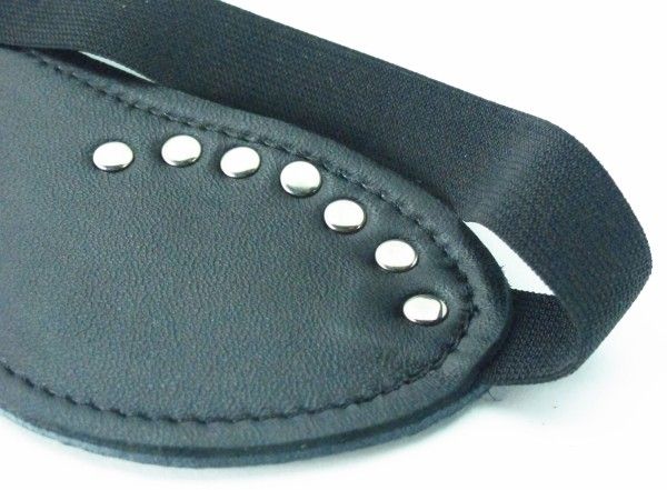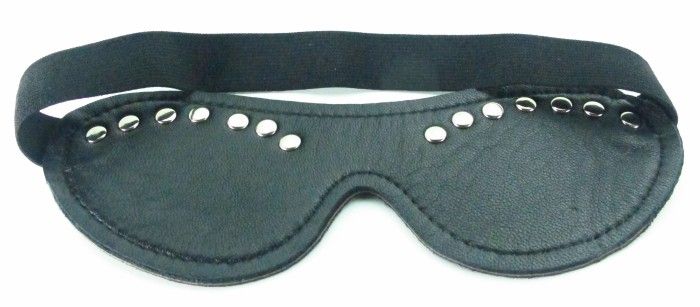 Черная маска из кожзама, декорированная заклепками. Крепится к голове при помощи удобной резинки. Длина маски - 19,5 см., ширина - 7 см.
