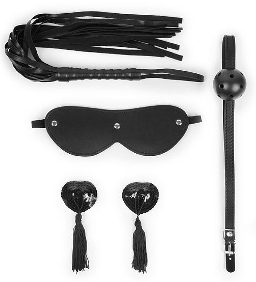 Великолепный набор аксессуаров для любителей БДСМ-игр. В комплект входят плеть, кляп, маска и пэстисы для украшения сосков. Плеть-флогер состоит из длинных хвостов и удобной рукоятки с петлёй для наматывания на руку или подвешивания на крючок. Кляп оснащён шариком с отверстиями для дыхания.
