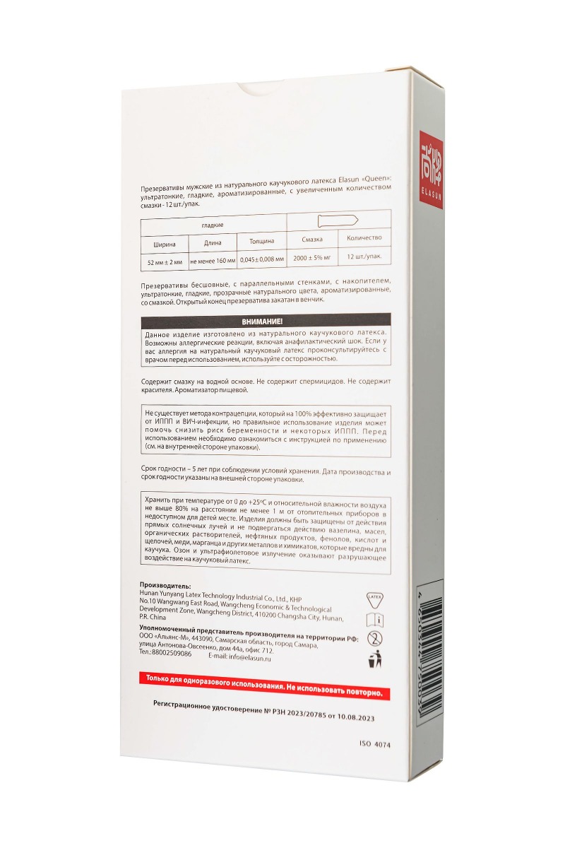 Elasun Queen — это новое поколение ультратонких презервативов, созданных для максимального комфорта и естественных ощущений. Изготовленные из натурального латекса и прошедшие строгую электронную проверку, они обеспечивают надежную защиту, при этом почти незаметны благодаря толщине всего в 0,02 мм. Эти презервативы передают тепло тела, создавая эффект полного погружения в момент близости, словно презерватива и вовсе нет. Благодаря гладкой поверхности и большому количеству лубриканта на водной основе, Queen гарантирует мягкость и плавное скольжение, делая каждый момент максимально чувственным. Презервативы не имеют запаха, а их классический дизайн обеспечивает надежное прилегание, предотвращая нежелательные ощущения и обеспечивая безопасность. Queen — выбор для тех, кто ищет гармонию между безопасностью, комфортом и непревзойденными ощущениями в каждом мгновении близости.