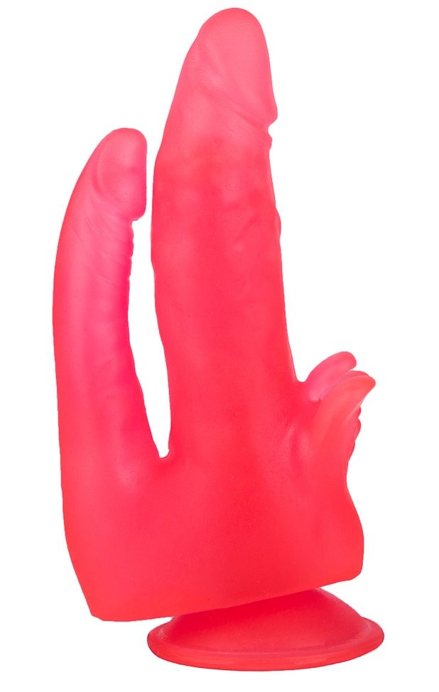 Получить двойное наслаждение проще, чем может показаться. Эта секс-игрушка из бархатистого на ощупь розового геля представляет собой два сросшихся в основании фаллоса. Тоненький ствол с чуть вытянутой головкой идеально подходит для анальной стимуляции. Крупный, с пышными венами и мягкими лепестками для клиторального массажа, подарит самые чувственные проникновения в лоно. Одновременная стимуляция внутри и снаружи – гарант действительно сильных ощущений и мощного оргазма. Подошва-присоска облегчит пользование реалистичным стимулятором. Диаметр анального отростка – 2,1 см.